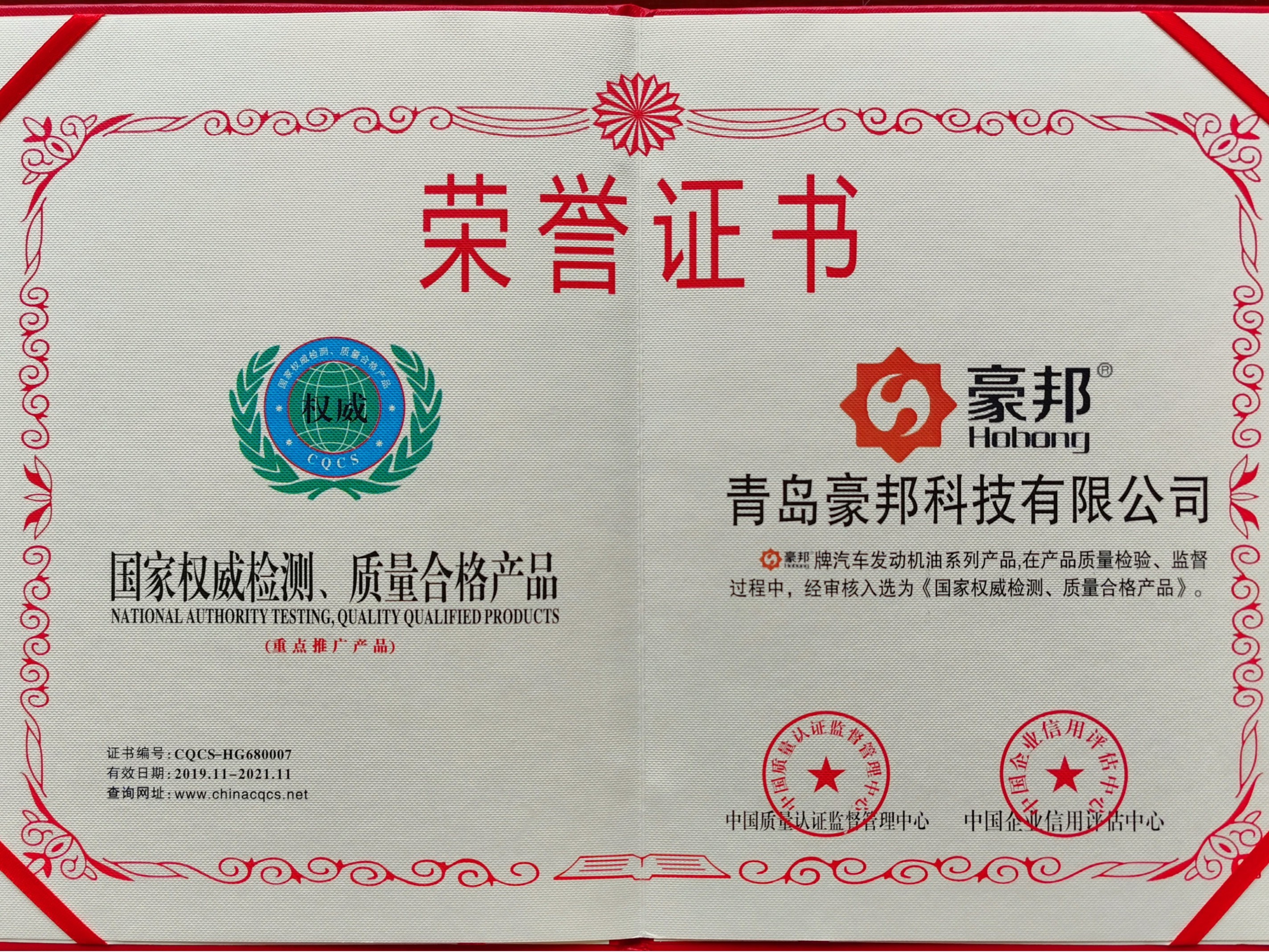 2019年11月,青島豪邦科技有限公司獲得中國質量認證監督管理中心頒發的《國家權威檢測質量合格產品》榮譽證書,證書編號:CQCS-HG680007。中國質量認證中心(CQC)是經中央機構編制委員會批準,由國家市場監督管理總局設立,委托國家認監委管理的國家級認證機構。中國質量認證監督管理中心通過對豪邦機油進行嚴格的指......